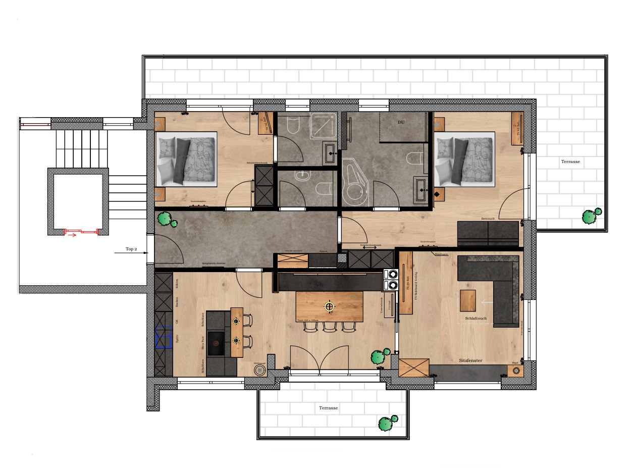 Das Appartement liegt im 1. OG und ist circa 100 m² groß, mit zwei großen Terrassen, welche von allen Räumen aus erreichbar sind.